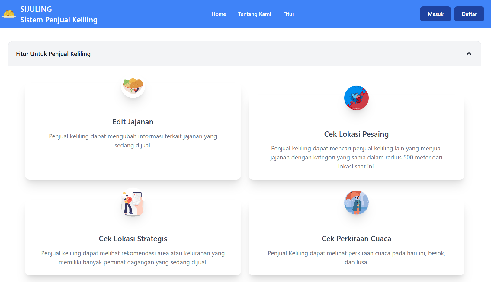 SiJuling mampu memberikan informasi penting untuk para penjual keliling, mulai dari informasi lokasi pesaing, lokasi strategis, hingga perkiraan cuaca.