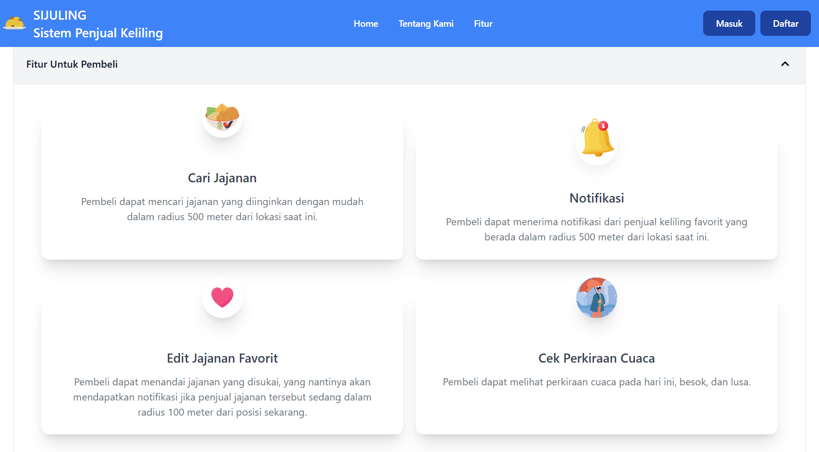 Tidak hanya fokus pada penjual keliling, SiJuling juga sangat memperhatikan fitur untuk pembeli. Pembeli dapat mencari jajanan yang diinginkan dengan mudah, menandai jajanan favorit, dan melihat perkiraan cuaca.